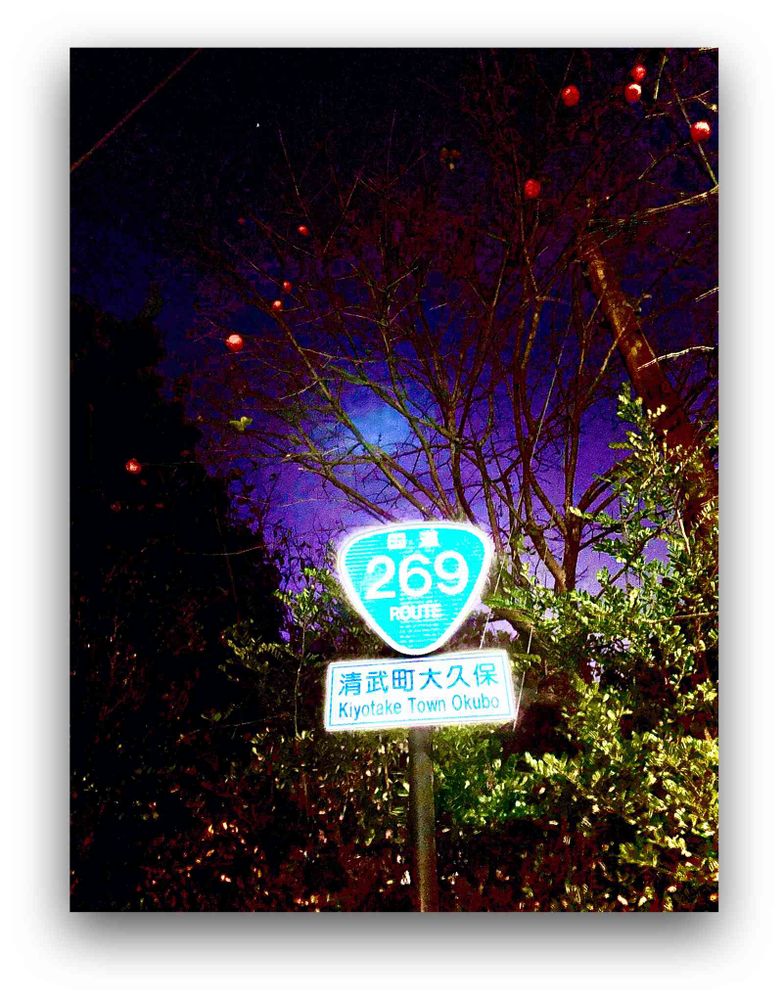 この場所は「国道269 ROUTE」「清武町大久保 Kiyotake Town Ohkubo」の標識にあるように、我が郷里の地区で、このすぐ脇には、宮崎交通の「大久保小学校入口」のバス停の標識もあります。