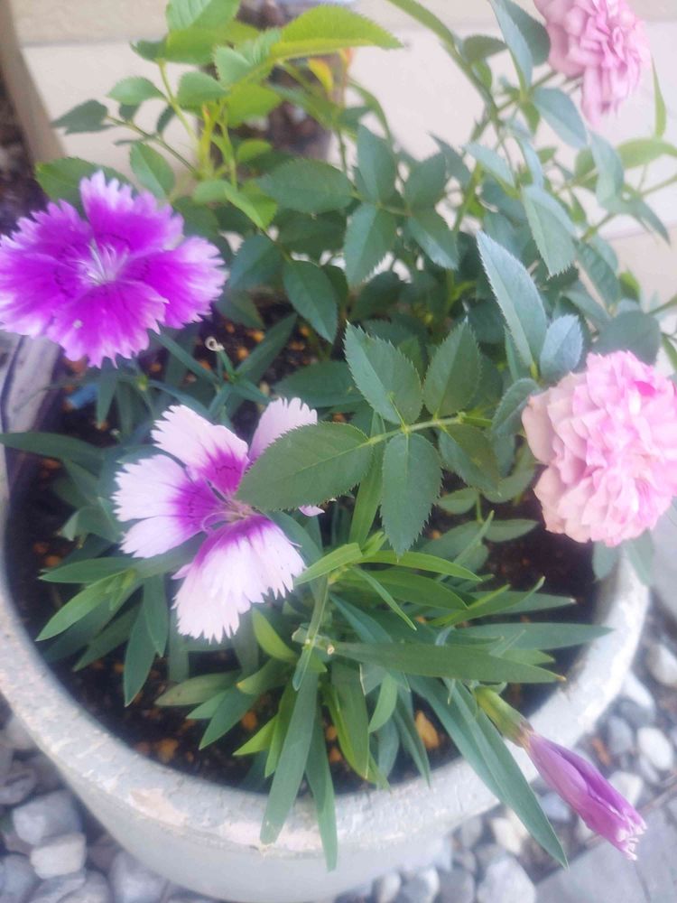 ナデシコで、こんな鮮やかな紫があるんですね~✨ミニバラさんと寄せ植えです(^^)
