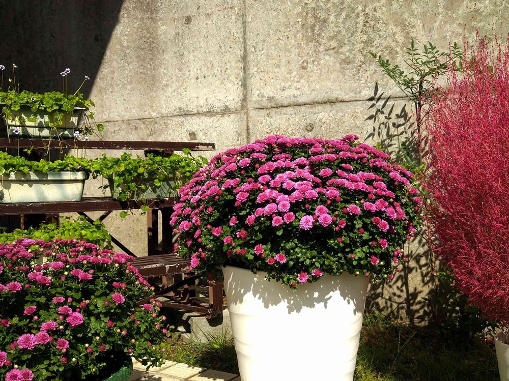 コキアの紅葉からガーデンマムのダークピンクへバトンタッチです😀