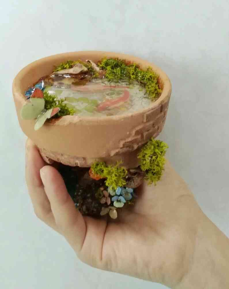 金魚の池を作る予定でしたが、使用したレジン液が硬化中にかなりの高温になってしまい土台のスチロールシートが溶けて、失敗しました。