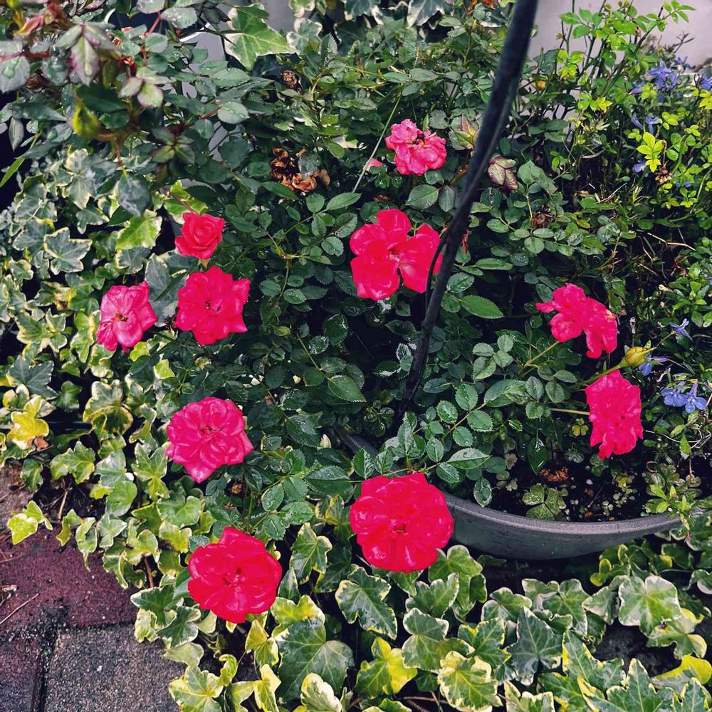 ミニ薔薇を三種類寄せ植えにして半年、メローネがたくさん咲いてます。
