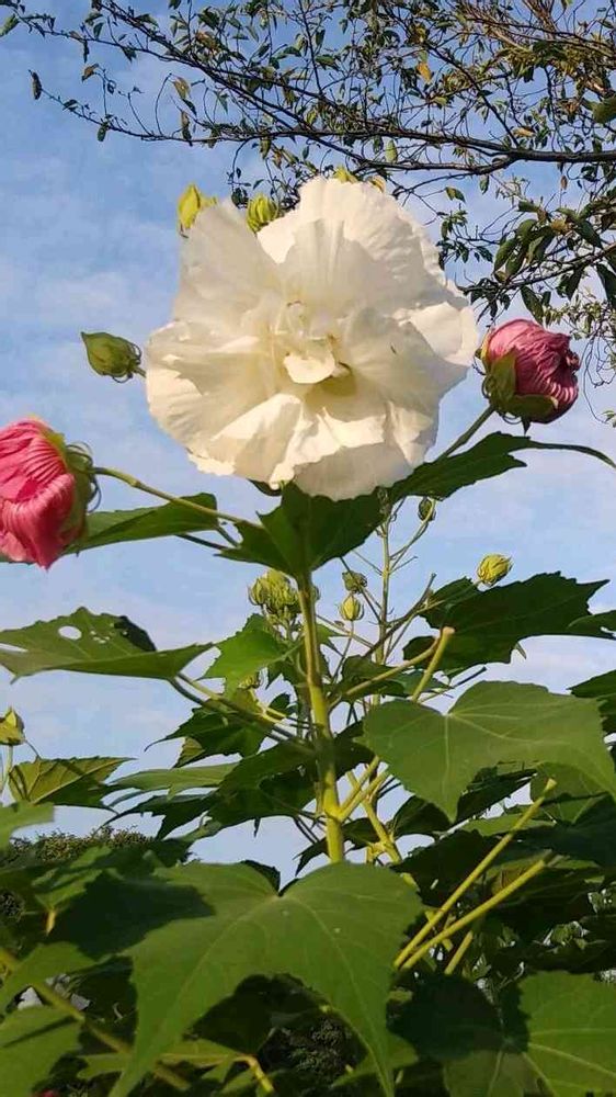 酔芙蓉が青空の下で綺麗に咲いてます✨
