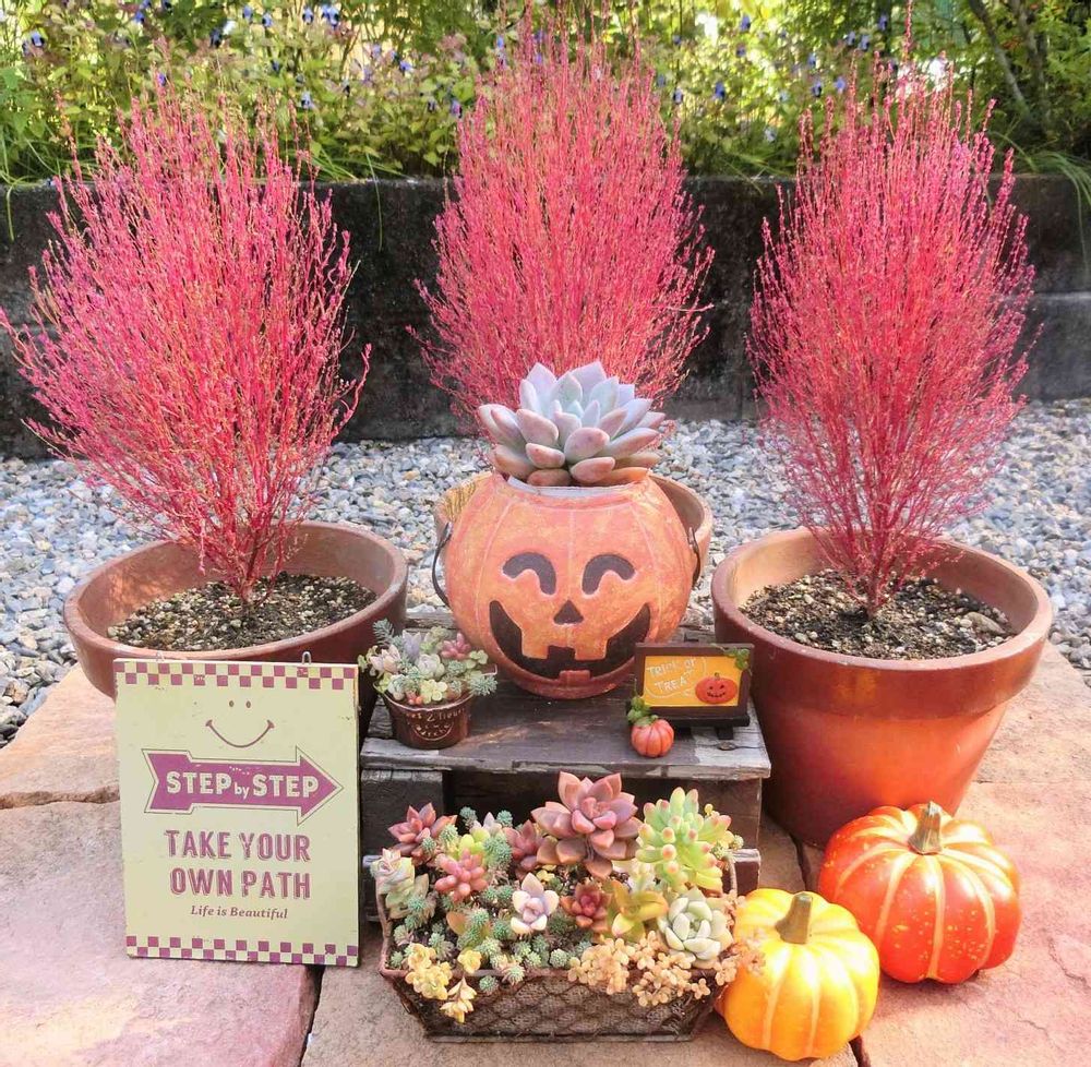 真っ赤になったコキアに囲まれて、パンプキンも🎃可愛い多肉さん達も楽しそうだね〜❤️🎶ゎ‹ゎ‹(ू•ω•ू❁)ゎ‹ゎ‹