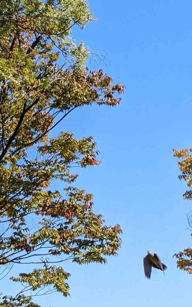 公園の木々を撮影しましたら右下にハト が写っていてハットしました🖐😳🤚💦
