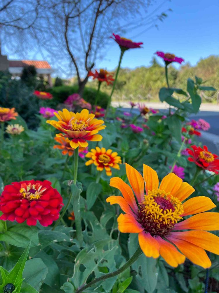 気持ちのよい青空にご挨拶してるジニアさんたち❤️🧡💛💚