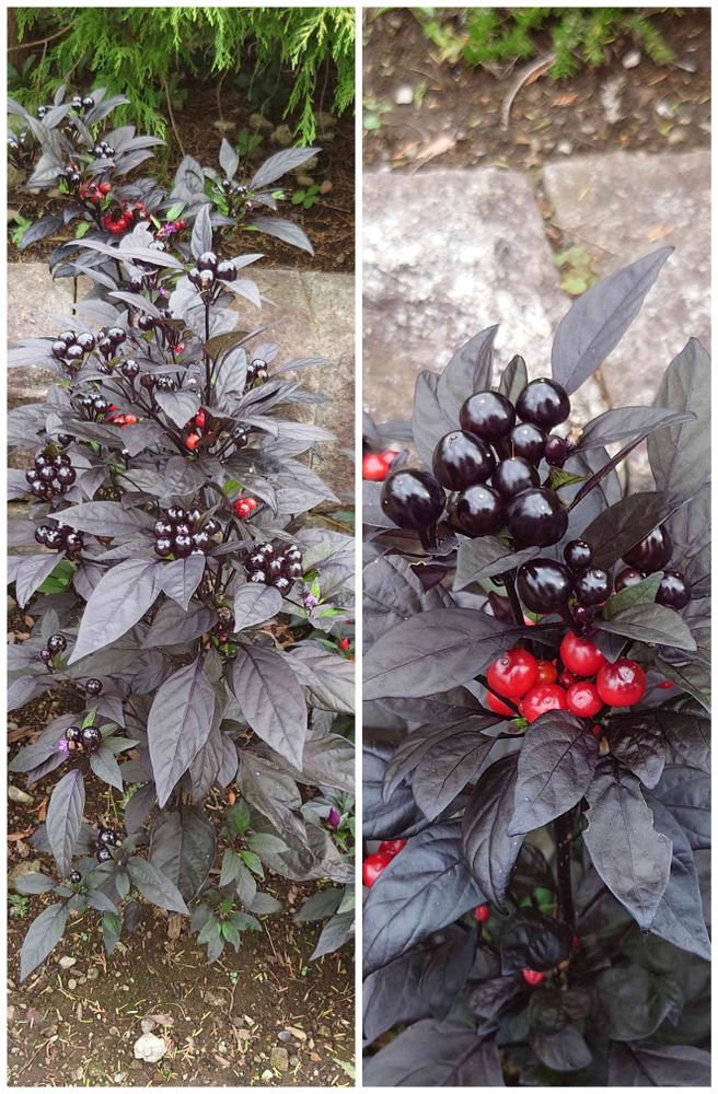直近の鑑賞用唐辛子「ブラックパール」の様子です。きれいな赤玉❤️も、やがて怪しく輝く暗黒軍団に飲み込まれていくんでしょうね🖤😎🤭(農業試験場内にて)