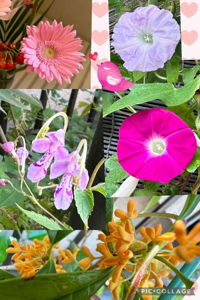今日はピンクの日なので今朝咲いた桃色カリガネソウと薄いピンクと濃いピンクの朝顔。ピンクのガーベラを出します。下の金木犀は今朝家で咲いたのでいっしょに。毎年花が増えて嬉しい😃。