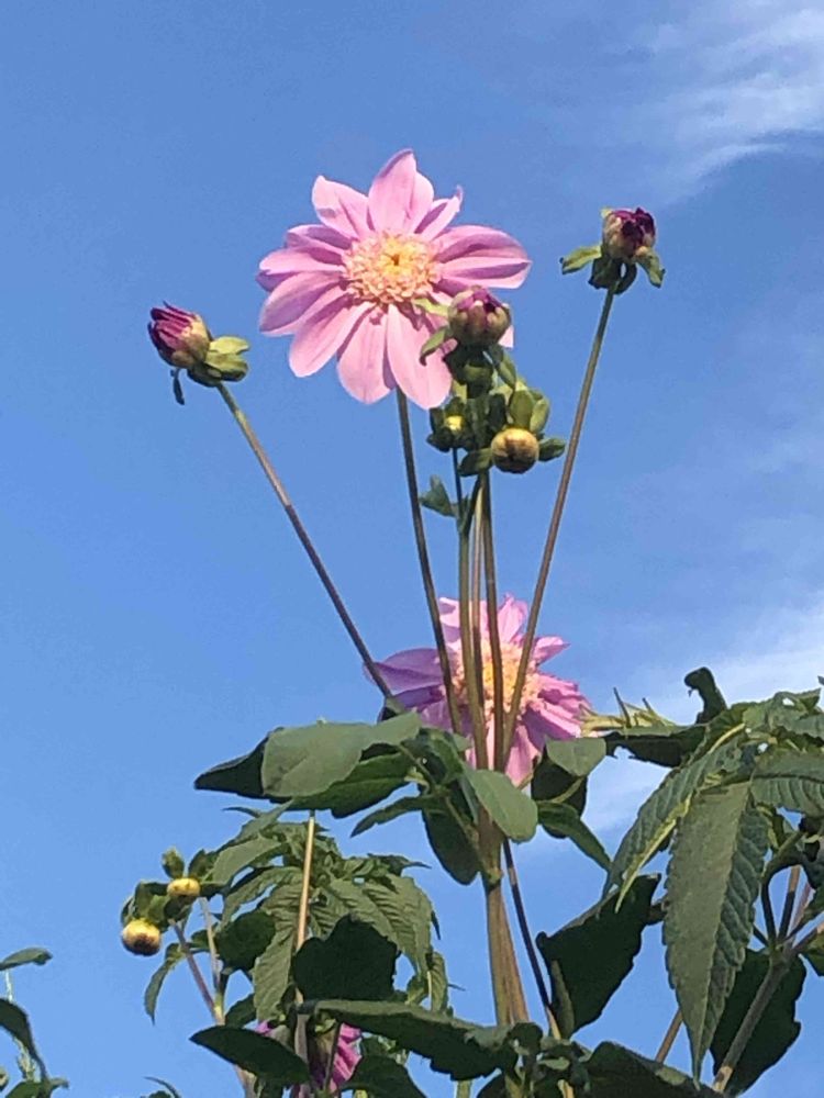 青空のもと、ピンク色に輝く一重咲き「皇帝ダリア」をパチリ!📸🌸🌿😄🤗🌞👌