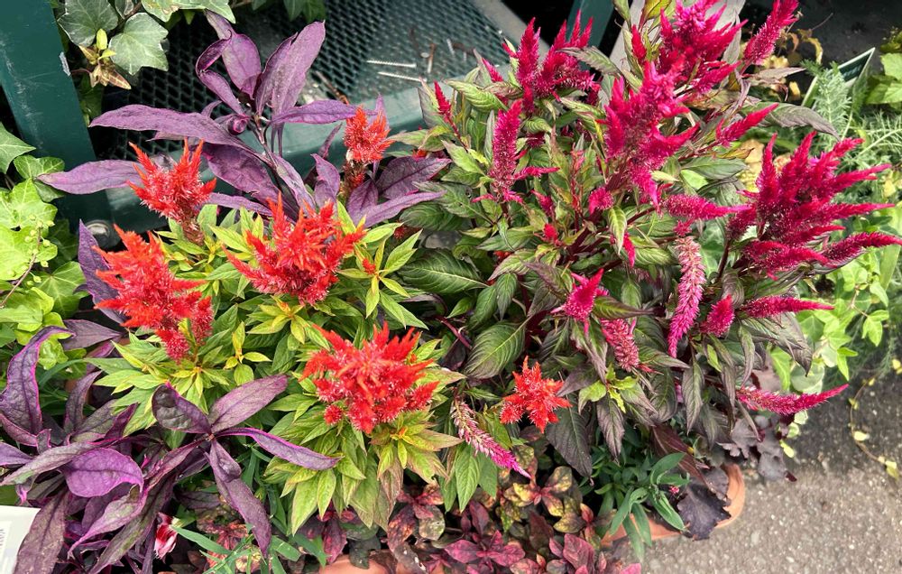 オレンジ、濃いピンクのケイトウに秋色のカラーリーフを合わせた寄せ植えです🪴