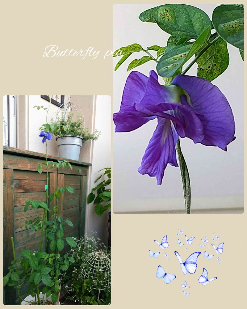 春から育ててもう80cmほどにも伸びたバタフライピーにやっと一輪花が咲きました。