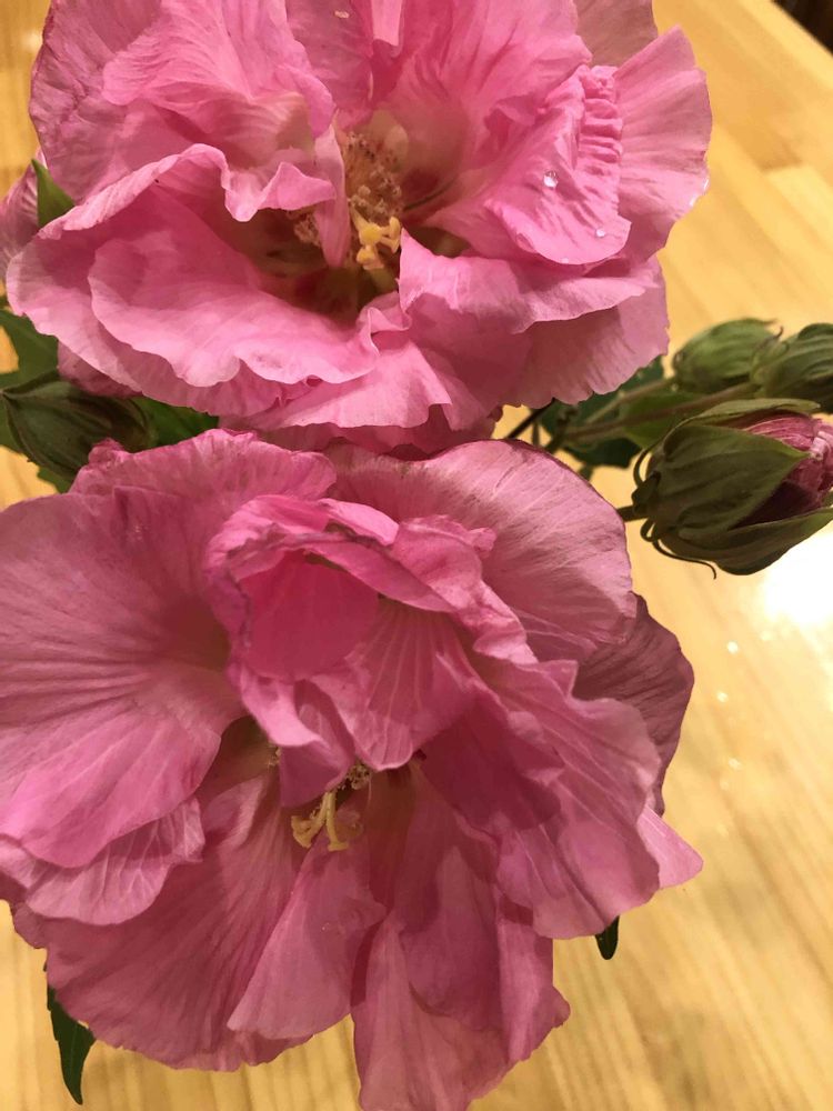 おじちゃんがフヨウの木からお花を切り分けてくれたのですが、おじちゃんの木は高さ3メートル、幅5メートルくらいはあると思われる大きな木です。そこにこの八重咲のフヨウが沢山咲いていて圧巻ですよ🤗