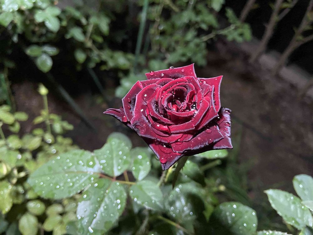 ロサオリエンティスのブラックバッカラです。庭に植えた中でも、樹勢が一番強いバラです。しずくがきれいにのっていたので、写真に残してみました。雨に濡れると花びらが傷んでしまう子も多い中、このバラは凛と咲いていました😄