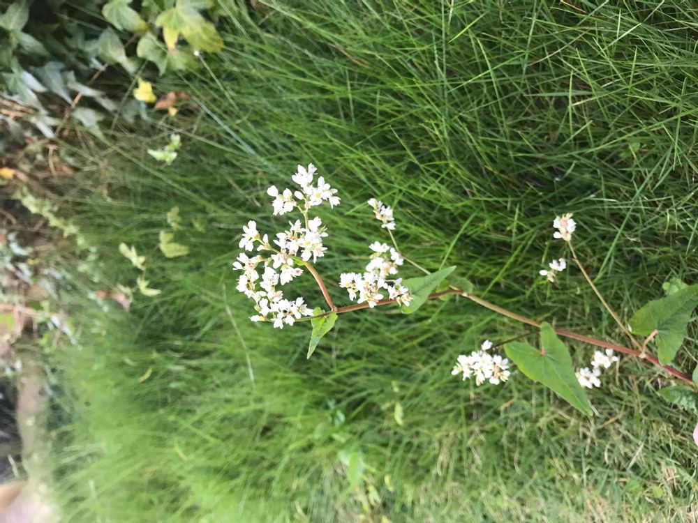 庭のあちこちに咲いています。白い小花で葉っぱはトンガリ気味のハート型です。