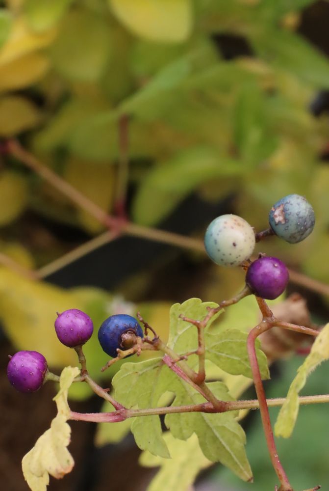 庭で鉢植えの斑入りノブドウの実が色づいています。