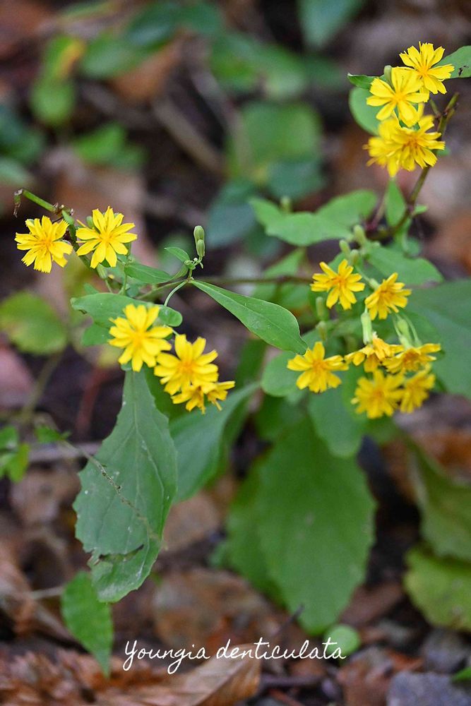 ヤクシソウ(キク科オニタビラコ属)は、日当たりのよい山地のやや乾いたところに咲きます。節ごとに少し折れ曲がった茎が特徴的です。オニタビラコの仲間ですが、全体に無毛であることと、花の後で頭花は下向きになる性質を持っています。