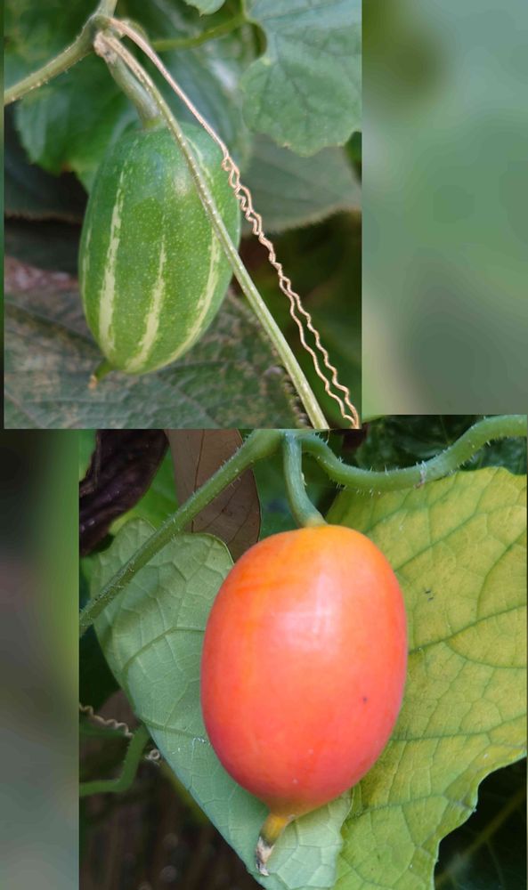 秋も深まってオレンジ色のカラスウリの実が色付きました、青い実もまだ残っています🟢🟠🌿