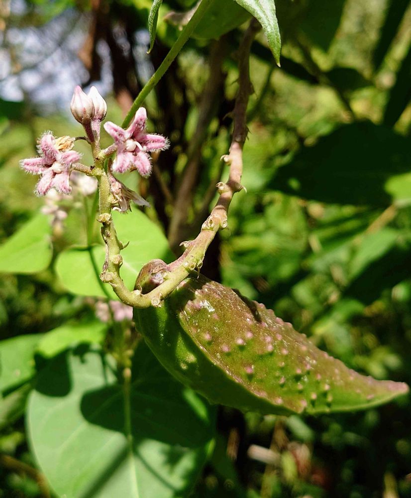 可愛い紅紫色のガガイモの花に大きな実が出来ていました、実が弾けてキラキラした綿毛が飛び出すのを見たいです🟢💜🌿