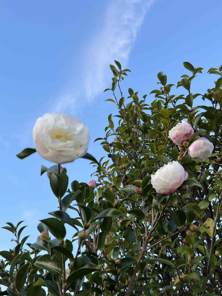 山茶花の蕾はピンクで、咲くと白い八重咲き