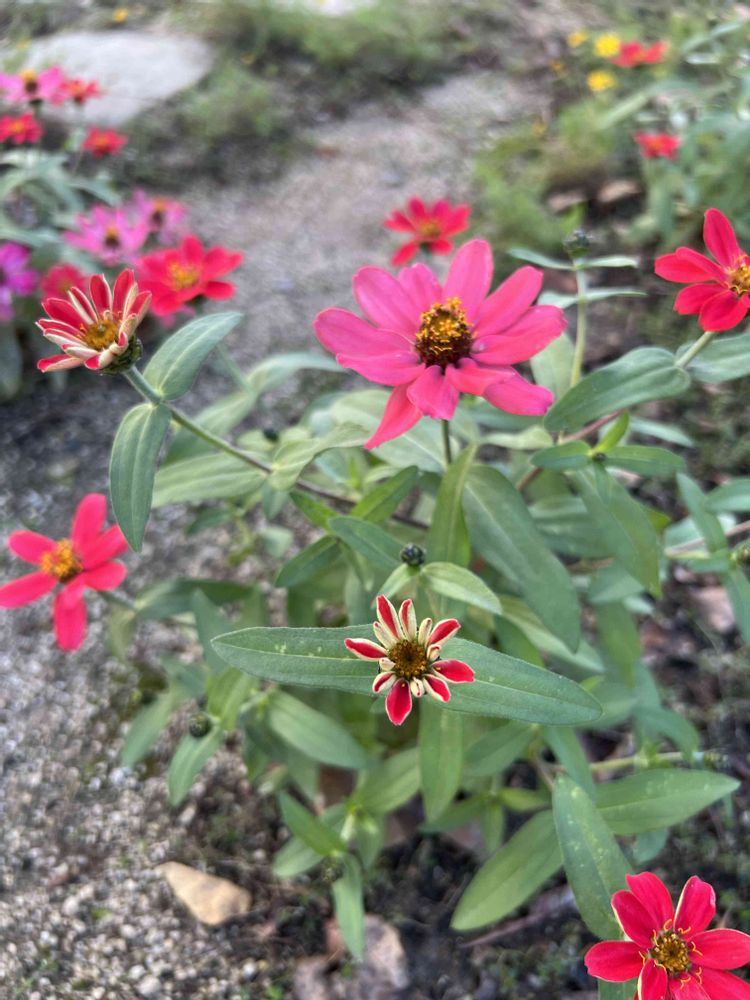 こぼれ種からのジニア、この色は花壇の中や外のあちこちに咲いています
