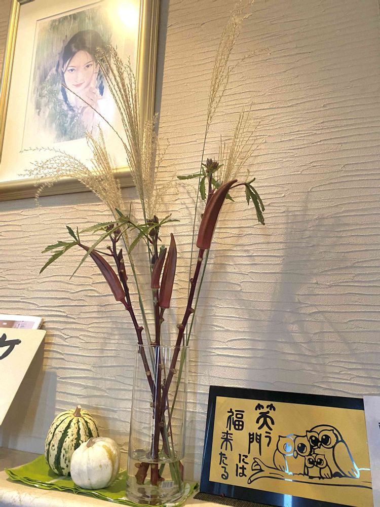 玄関を秋っぽくしてみた。 赤く色づいたオクラとススキ✨ そしてハロウィンカボチャさん🎃