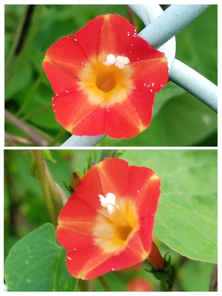 日課のウォークロード脇で、フェンスにずいぶんツルが巻いてきたなぁと眺めながら🚶いていたが、朱赤色の花が咲き始めた 😲