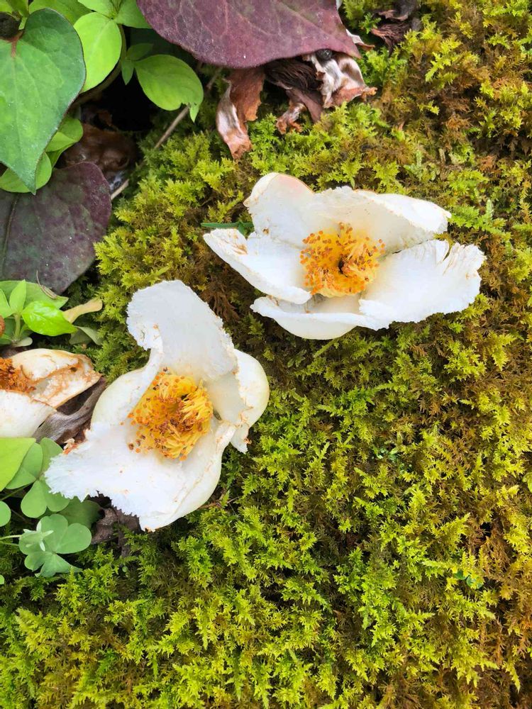 前に住んでいた大和市の遊歩道に夏椿があって、ようやく白い花に出会いました。大きな木からはいっぱい小さな花も落ちていて切ない感じでした。