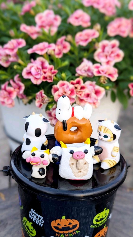 牛とハニワが合体!素晴らしい~👏👏👏 顔が愛嬌あって可愛いですね🤗SNOOPYちゃんもドーナツ🍩食べて満足寝😋
