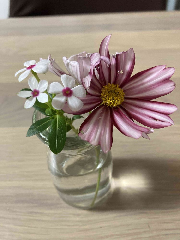 コスモスバローテと日々草です。色が咲く度に違うから見てて飽きないなぁ。