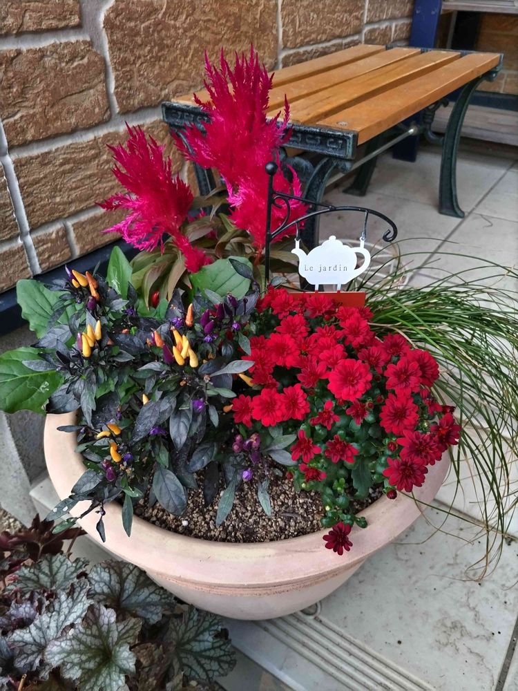 🌸寄せ植えのガーデンマムの花が開いてきました。