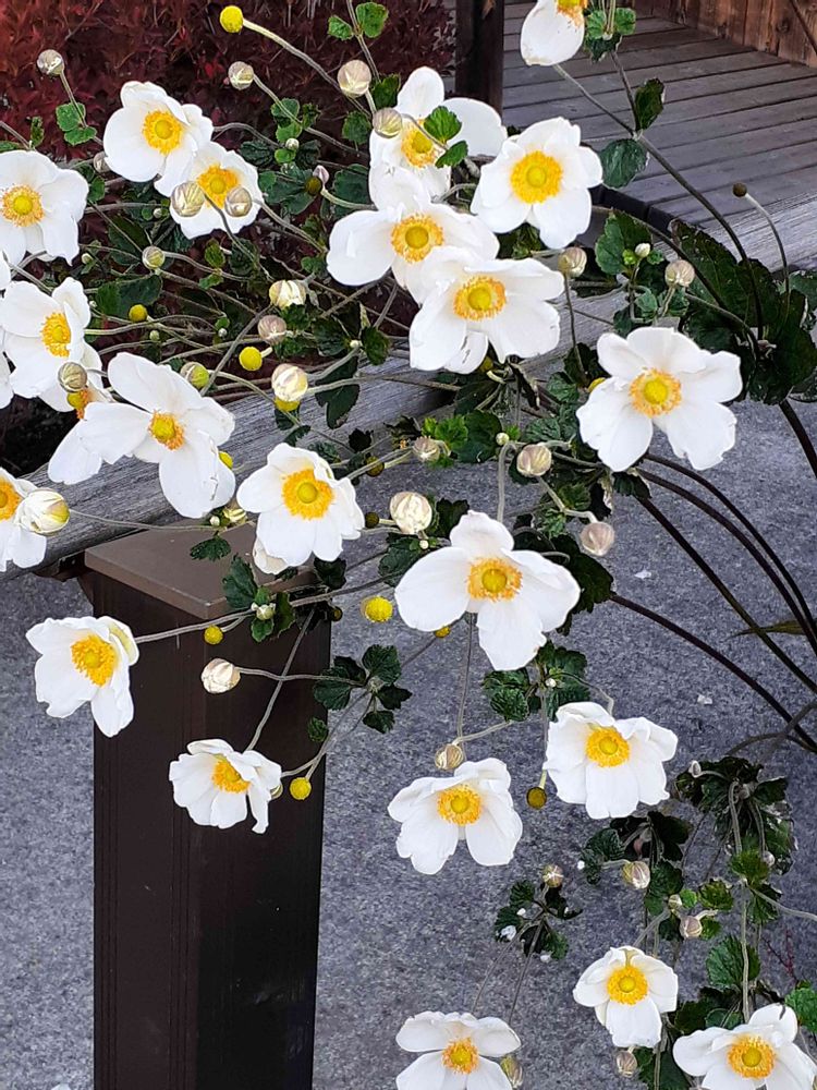 白いシュウメイギクが風に揺れて綺麗に咲いています