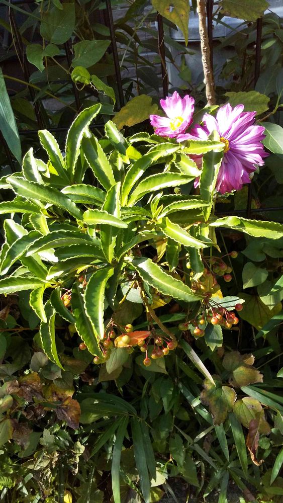八重咲きのシュウメイギクと、うっすら色づいてきたマンリョウの実。