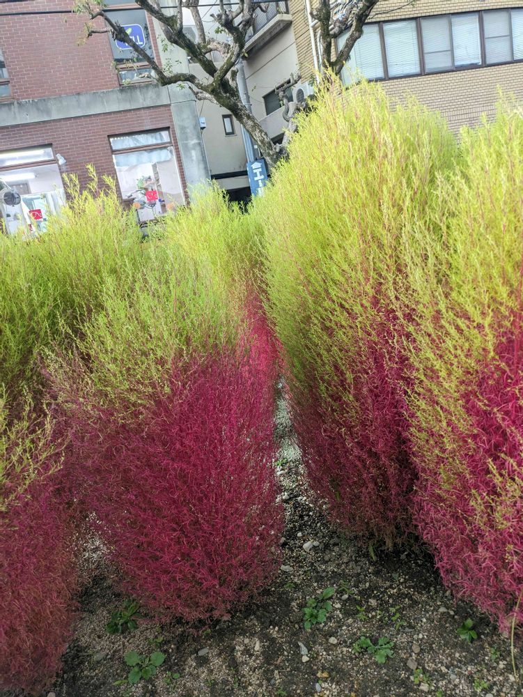 歩道脇のコキアは上半分緑、下半分赤のツートンカラーになりました。
