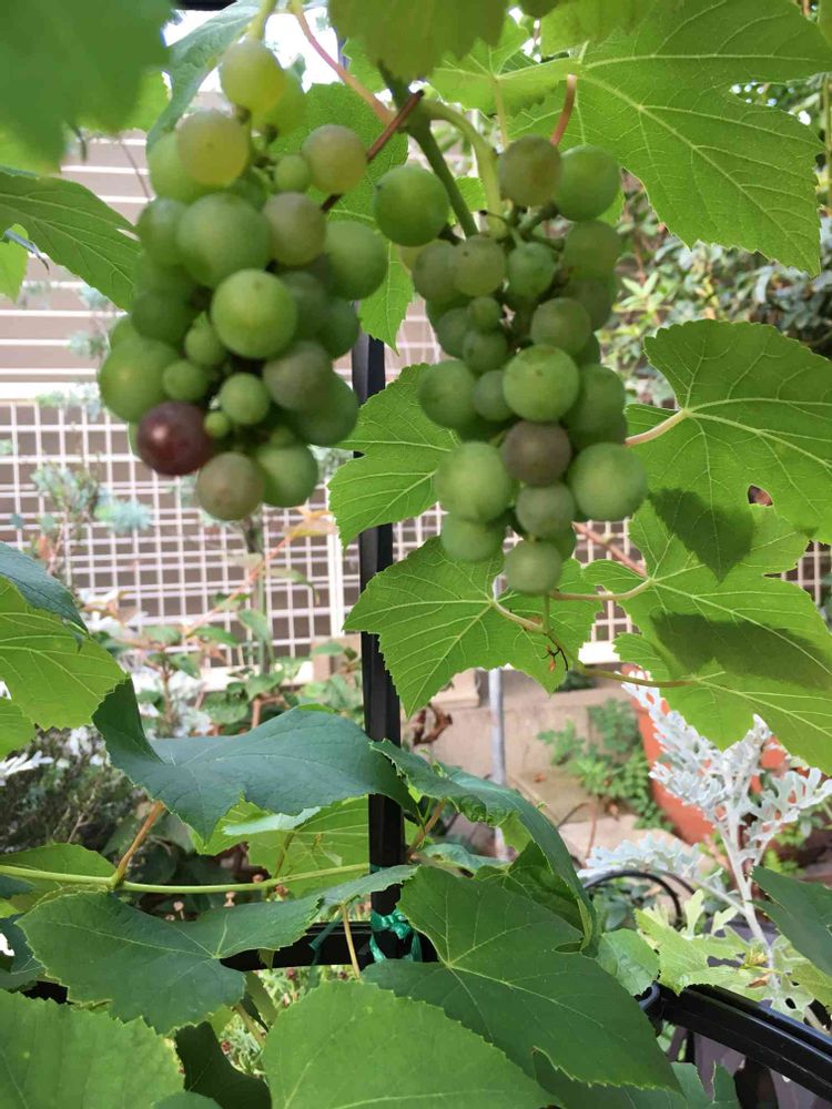 おばあちゃんの日除け用の巨峰、大きくなっても房が6個しかできませんでした。日除けには充分大きさはあるので、バシバシこれからは剪定ですかね。剪定ポイントを勉強しなくちゃ。来年期待しちゃうな〰️❤️