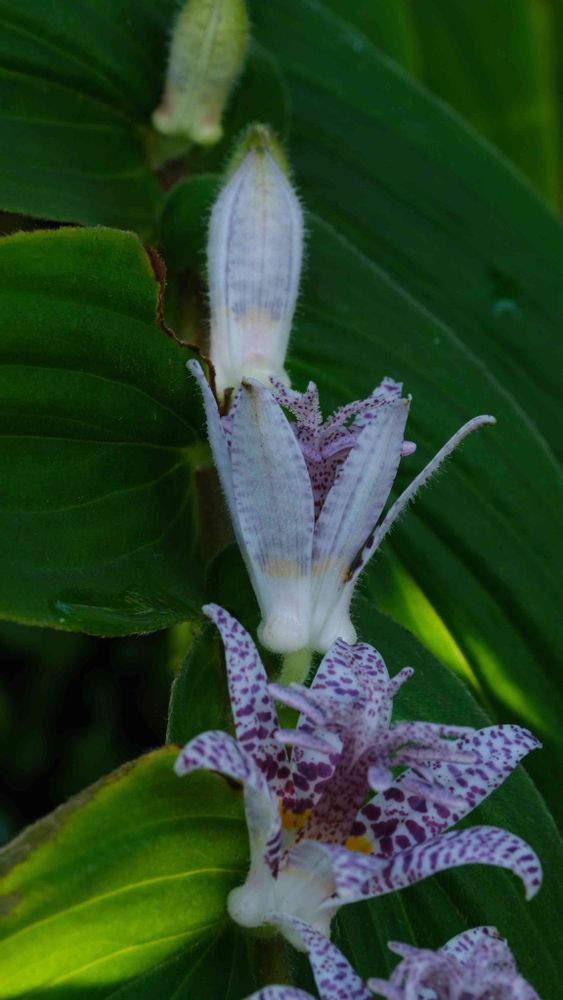隣に台湾ホトトギスの花粉がミツバチに着けて白いホトトギスの雄蕊に触れたかもしれない?🙄
