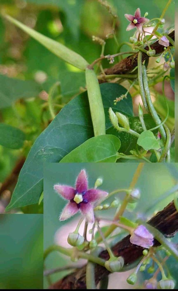 暗紫色のオオカモメヅルの花と大きな実が可愛いです💜🟢🌿