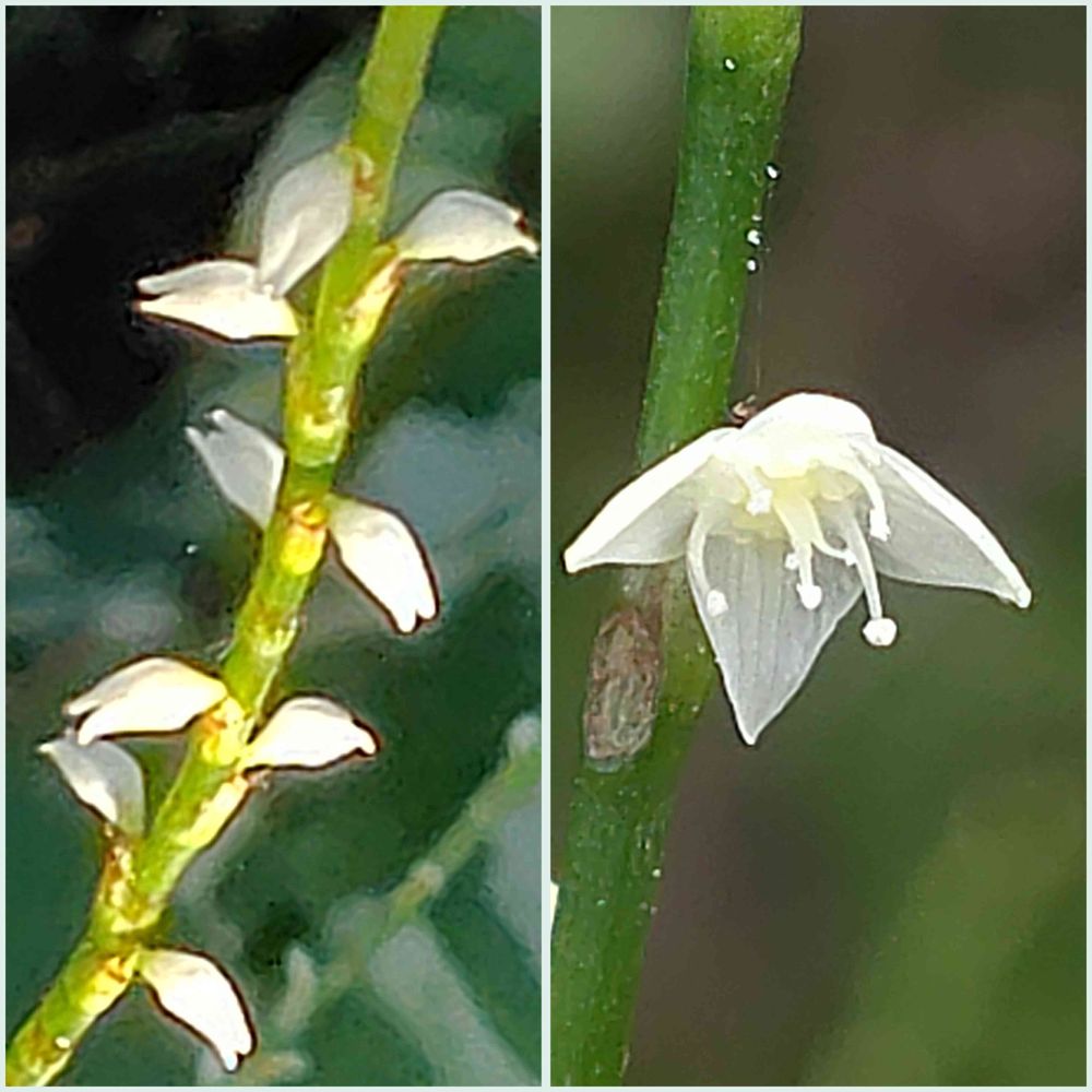 細い緑の棒に米粒が 段々にくっついてる様ないつもの花姿