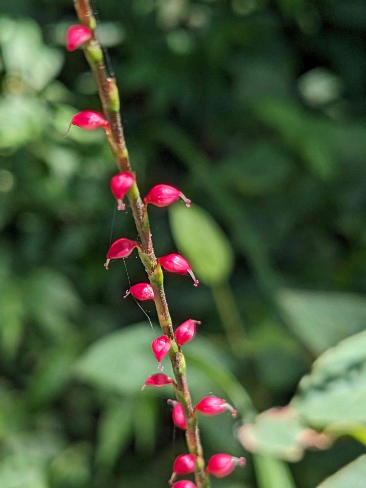 赤くて小ちゃい花姿、とても可愛いですね❤️「水引の赤三尺の花ひきてやらじといひし朝つゆの道」(与謝野晶子)💗