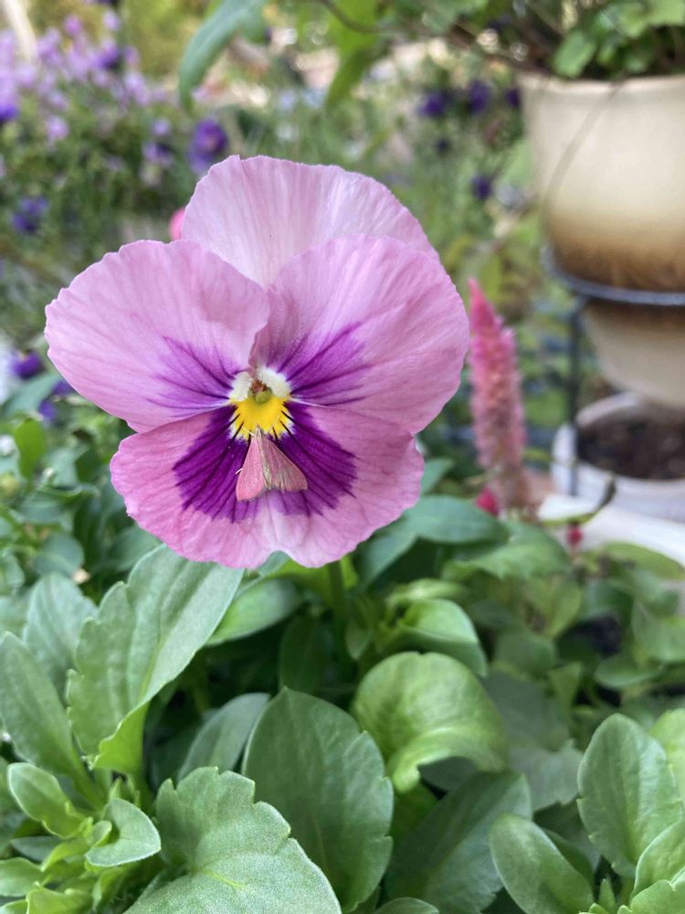 よく見たら 花弁の下のところに小さな蛾がいました 羽がピンクでビックリ🫢 何かの花粉でも付いたのかなぁ? これは寄せ植えのパンジーです