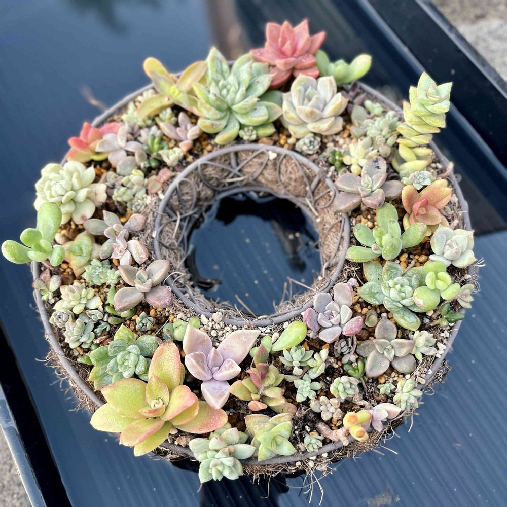 他のスカスカになってしまった寄せ植えも2つ解体して、その多肉たちで新たに多肉リースを寄せ直しました。根づくまで平置きにします。
