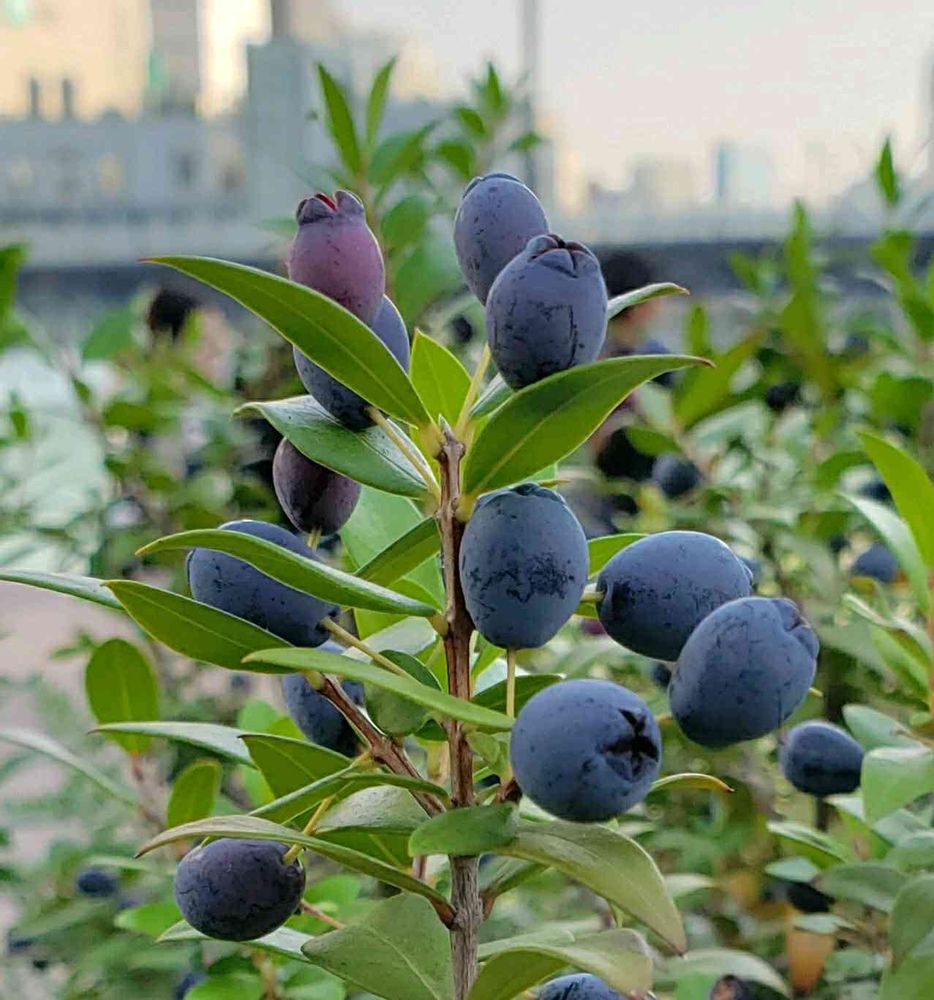 都心の公共テラスの植え込みに沢山のふっくら実を付けたギンバイカ(銀梅花)。