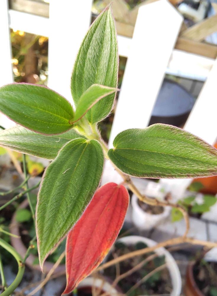 野紺野牡丹の葉っぱ、1枚だけ、秋色真っ赤❤️