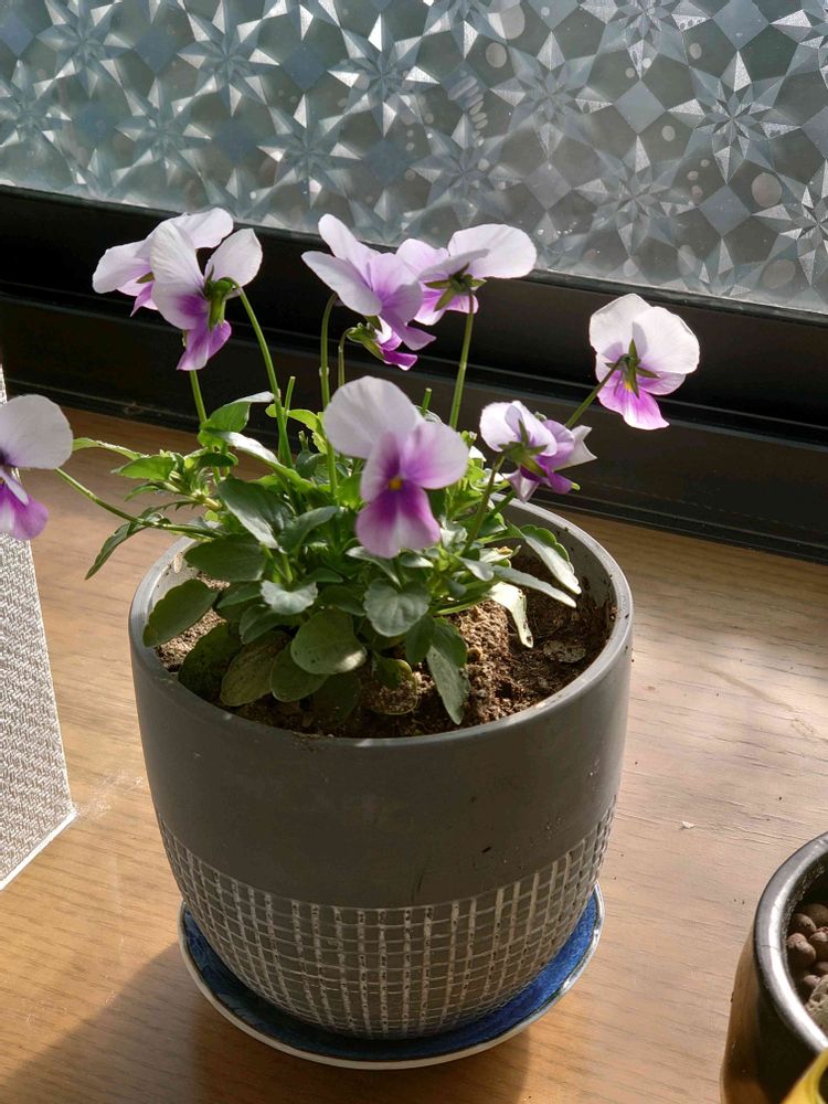 玄関の寄植えで溢れたビオラ、出窓でいい仕事してくれてます。
