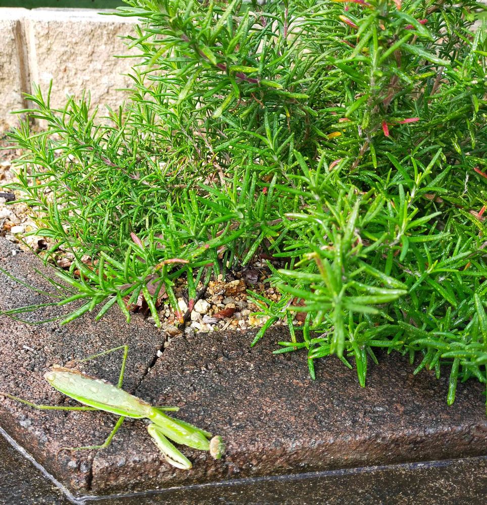 3枚目:今朝、水やりしていたら、よっちゃんに頂いたローズマリーの近くに、太ったカマキリさんが‼️ヘ(゚∀゚ヘ)