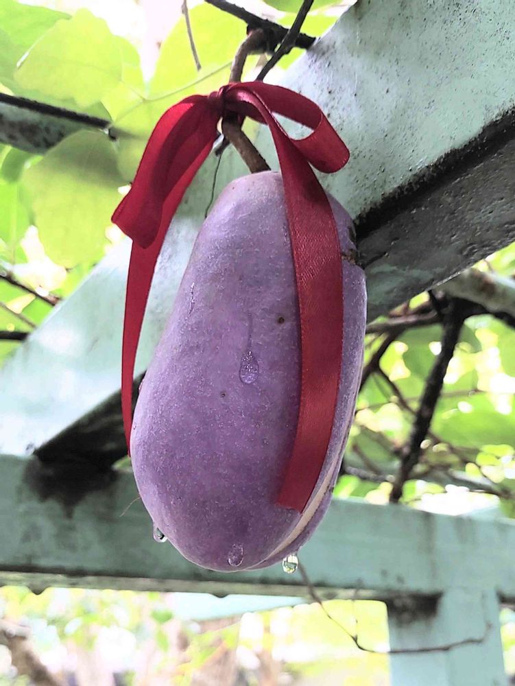 藤棚に上がるのは🐰くらいなので、緑色の小さな実を見つけたら🎀を付けておきます。