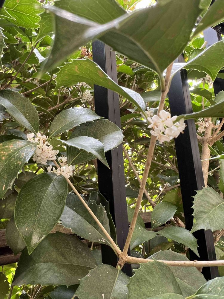 手前の生垣🌱葉っぱのギザギザが痛くて剪定するのも嫌だったのですが、切らないでおくとお花が咲くと聞き💞