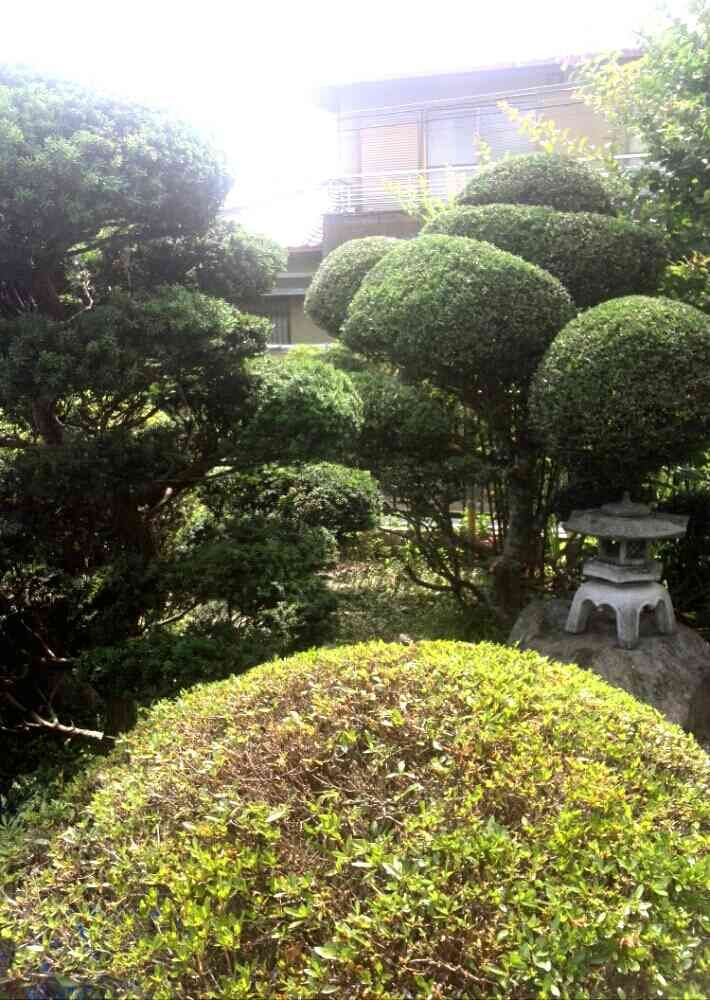 和の庭の刈り込み、はしごのぼり、何回も移動させながら…なんとかできました~。