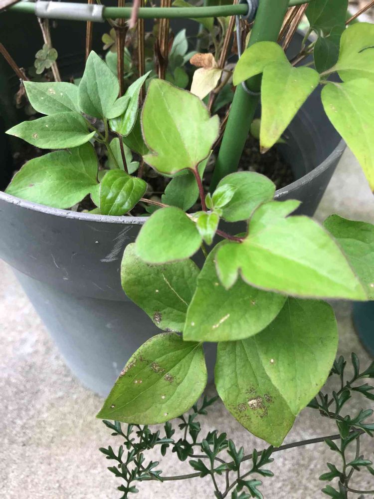 鉢の奥は、、なんだか汚くてお恥ずかしいのですが、これもクレマチスで旧枝咲きのものを挿し木して今年たくさん咲いてくれた鉢なんです。ピンク色のクレマチスで今は葉っぱのみ。それとは別に株元にあるのは、、カタバミですね🌱雑草生えてます🌱