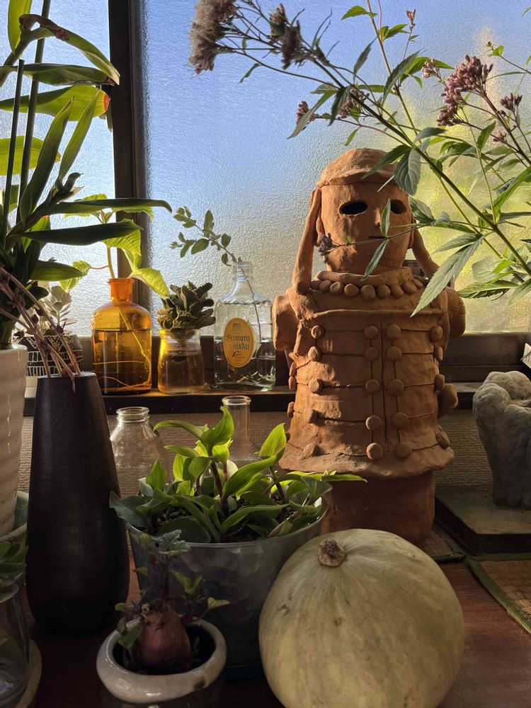 pic1 今朝の玄関。頂いた白カボチャがあったので手抜き🎃😅埴輪は長女が小5の夏作成