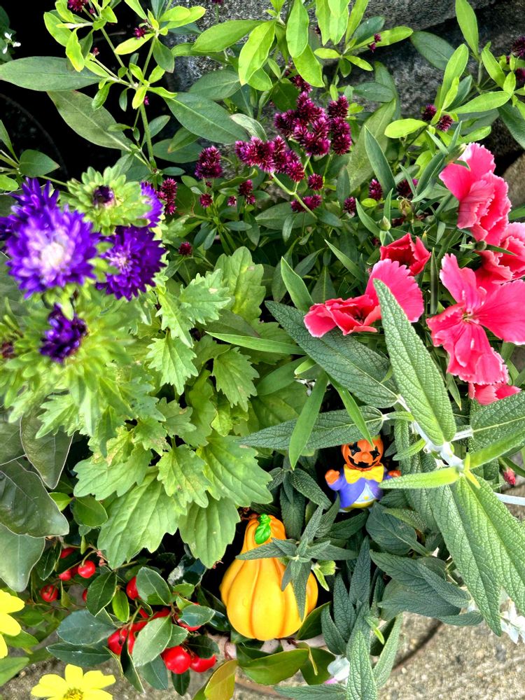 センニチコボウ、チェッカベリー、アスター、サルビアレウカンサフェアリーピンク、ダイアンサス等です🌿🎃