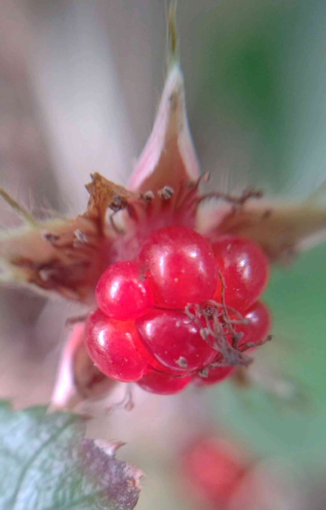 秋から冬の林には競うように赤い実がなるけれど、これもその一つで早くも熟しているものに出会った 真っ赤な火曜日🏷️🔴 たくさん伸びていた雌しべの花柱は、熟しても残って茶色い糸のようにこんがらがり、食べるとちょっと舌に触る🌀 ガクの内側には葯をつけたまま残った雄しべも見えている 火曜はマクロの発表会🏷️(^^)
